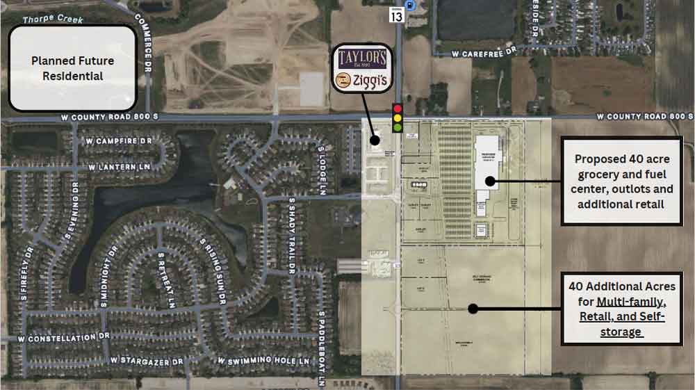 Located at the high-visibility intersection of IN-13 and W 800 S, this expansive 80-acre site represents one of the most compelling large-scale development opportunities in the rapidly growing Pendleton and South Madison County market.